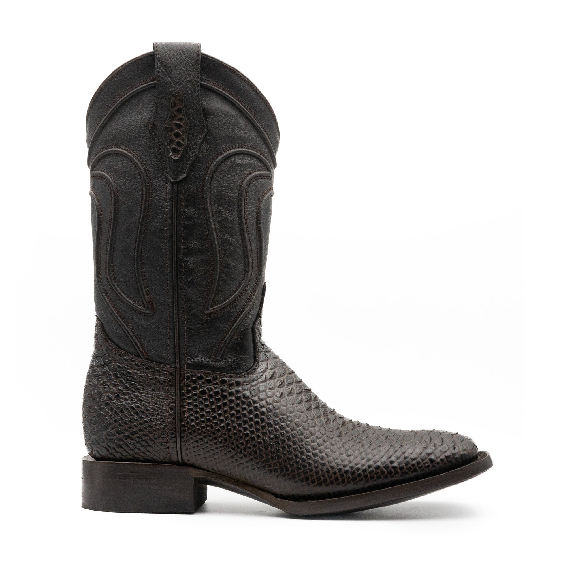Atrévete a destacar con esta bota en imitación de pitón color café, una pieza que combina la esencia indomable del estilo vaquero con una silueta refinada, textura de reptil cuidadosamente trabajada que aporta un carácter único y lujoso.
