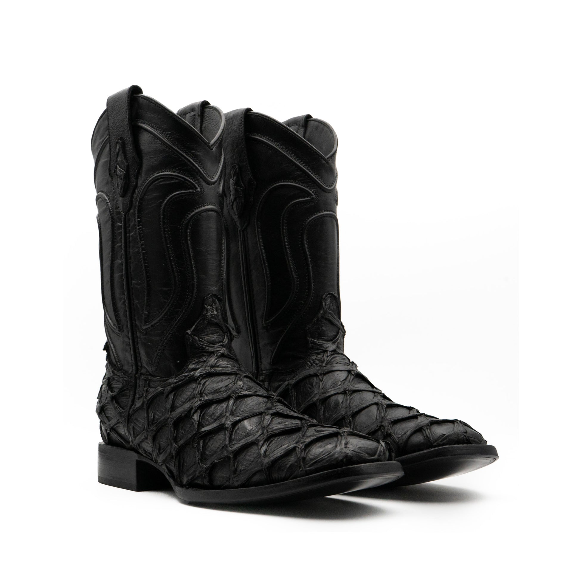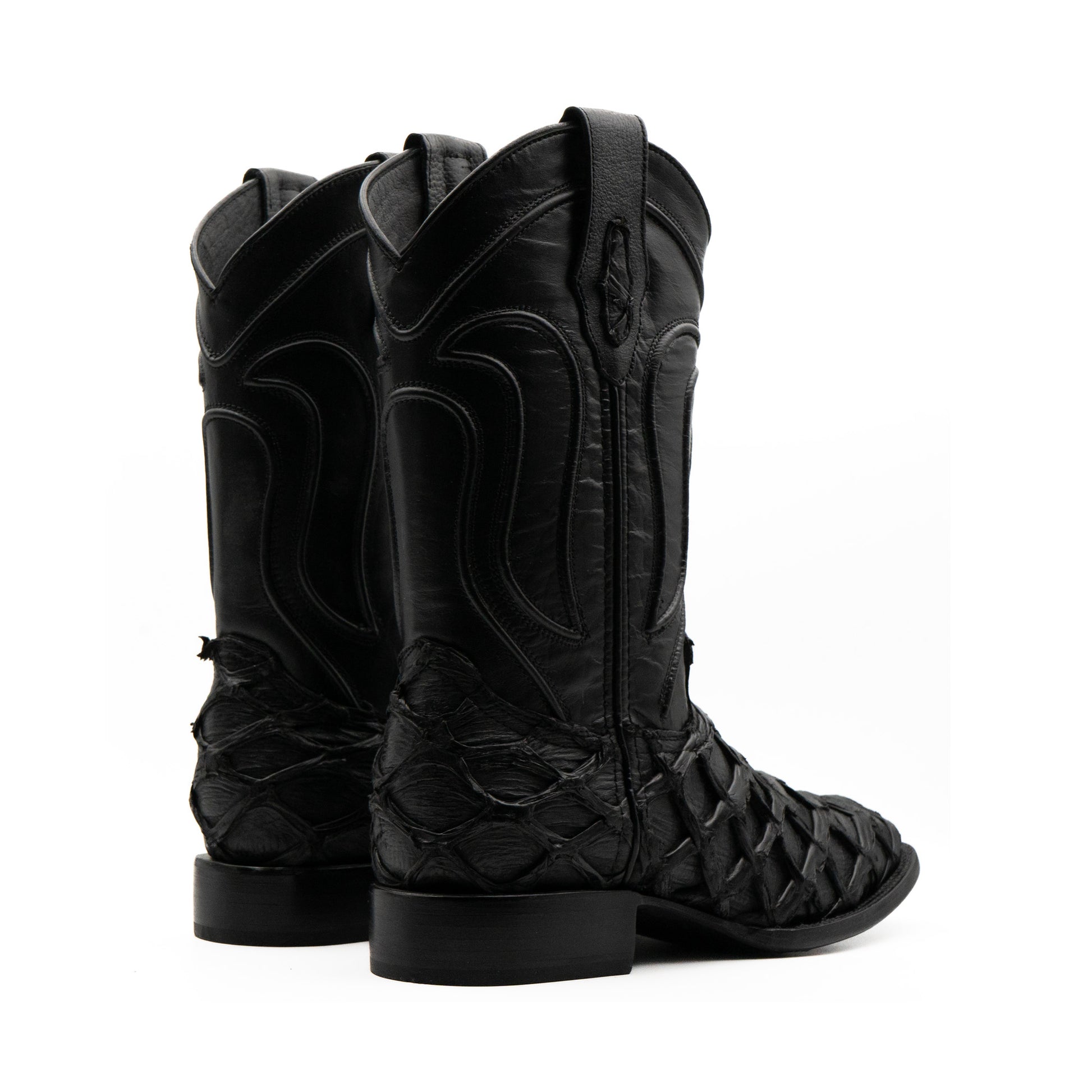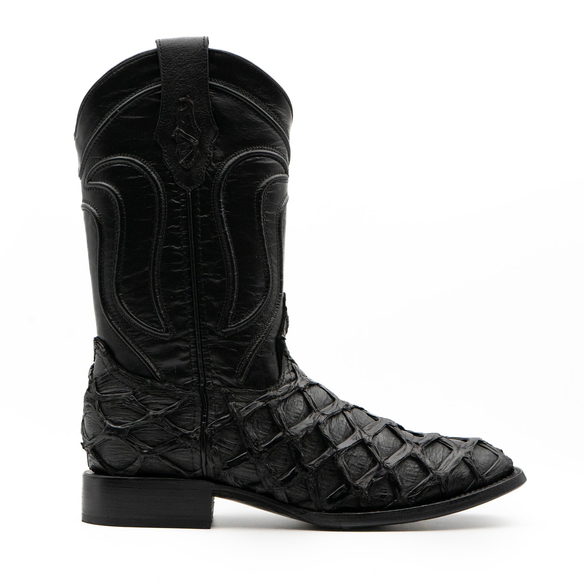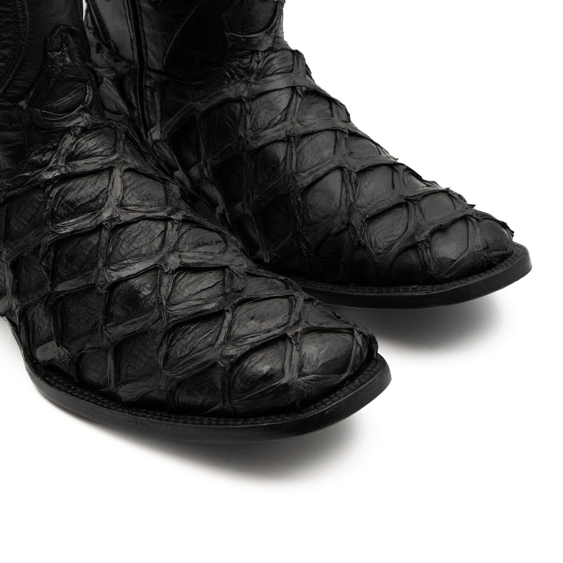 Esta bota vaquera elaborada en piel genuina de Pirarucú, reconocida por su textura escamada única y su alta resistencia. El color negro profundo realza cada detalle natural de la piel, proyectando carácter, lujo y presencia.